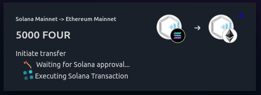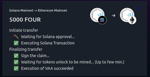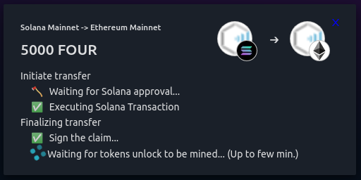 Enter the amount of FOUR tokens you want to transfer and execute bridging by confirming the transfer and waiting for the progress popup windows.