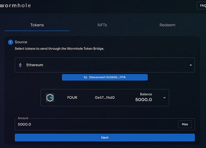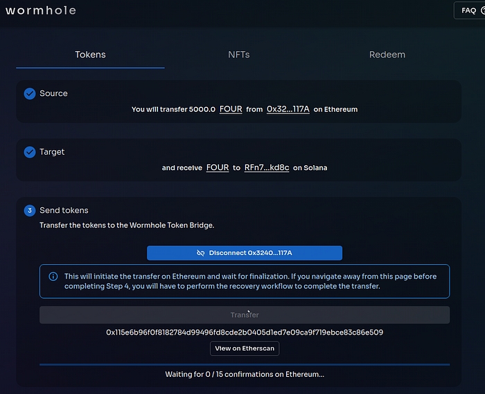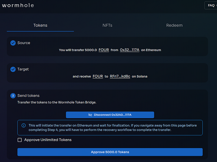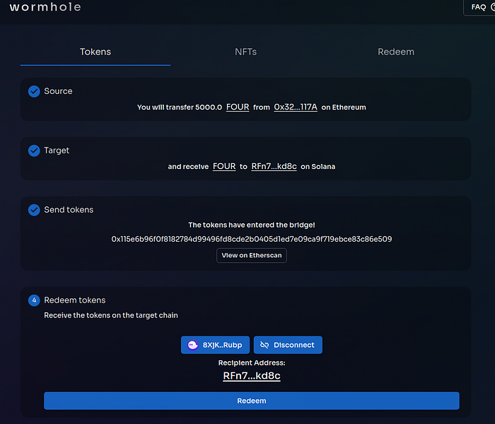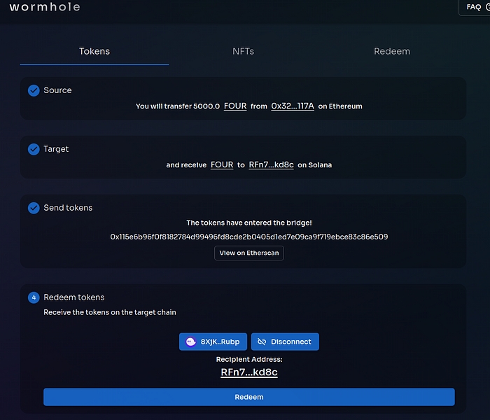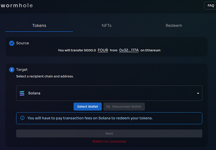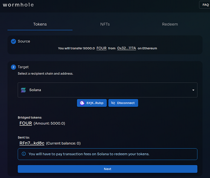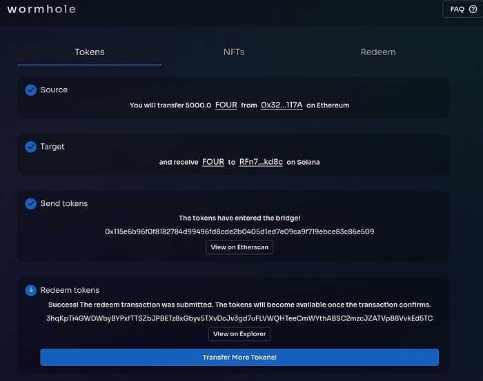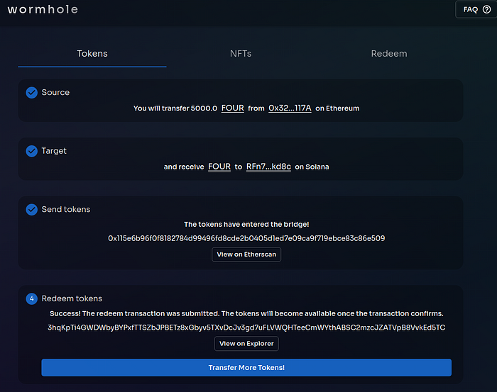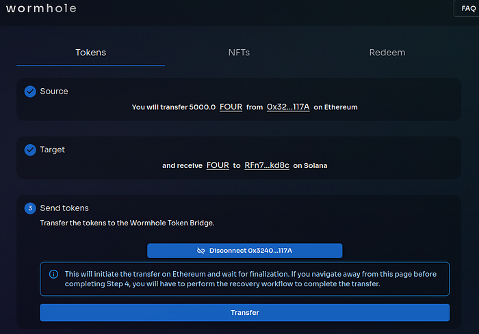 (1) Open the Wormhole bridge web page; (2) Connect the MetaMask wallet and Phantom Solana wallet; (3) Set the amount of FOUR tokens you want to transfer; (4) Execute the transfer, and; (5) Check the balance.