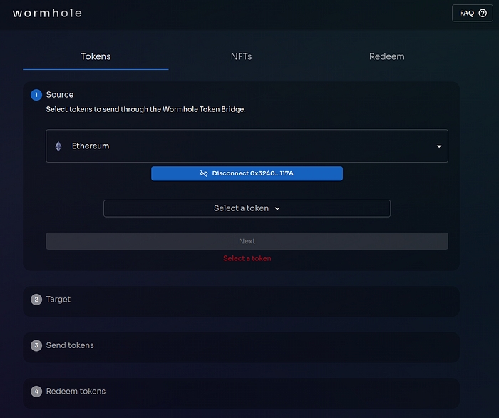 (1) Open the Wormhole bridge web page; (2) Select the source network and connect the MetaMask wallet (3) Select the target network and connect the Phantom Solana wallet; (4) Send FOUR tokens; (5) Execute the transfer, (6) Redeem tokens, and; (7) Check the balance.